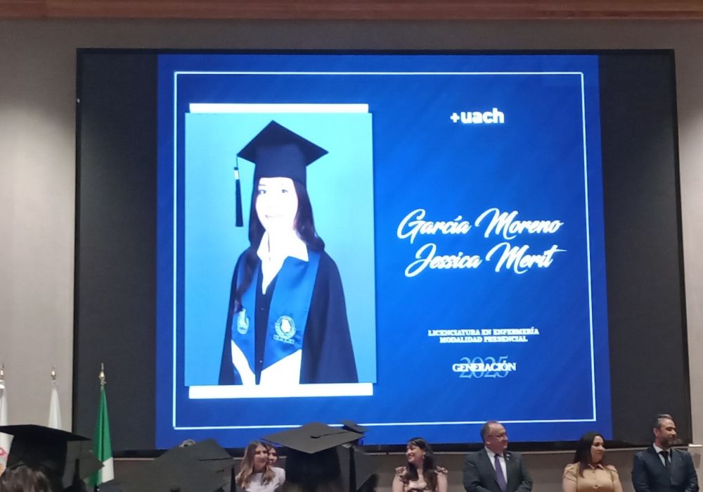 Con un emotivo mensaje del rector de la Universidad Autónoma de Chihuahua, maestro Luis Alfonso Rivera Campos se lleva cabo la ceremonia de graduación de licenciados y doctorados, así como maestrías, en un evento realizado en el Centro de Convenciones de la ciudad de Chihuahua, con graduandos de Delicias, Parral y Cuauhtémoc, pero sobre todo de la ciudad de Chihuahua… entre ellas la ya licenciada en Enfermería Jessica Merit García Moreno, quien fue captada al momento de su graduación y posteriormente con familia y amigos.