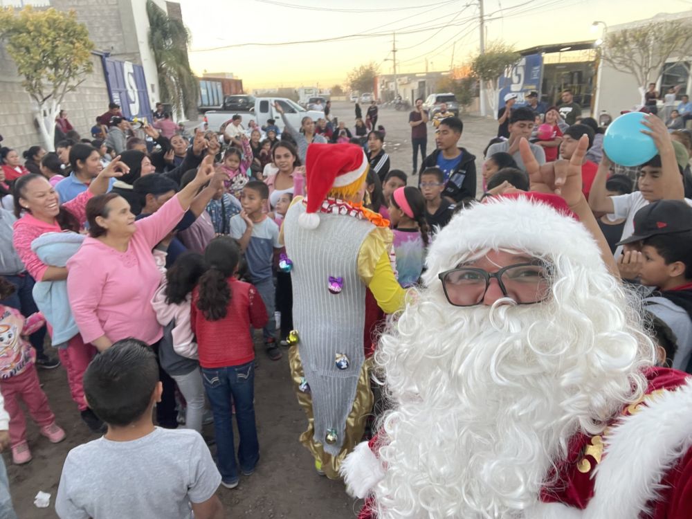 *. - Alegría, regalos, juguetes y ambiente festivo durante posadas que se llevan a cabo en comunidades de Delicias con el equipo del partido PRD y su regidor vestido de Santa Claus.