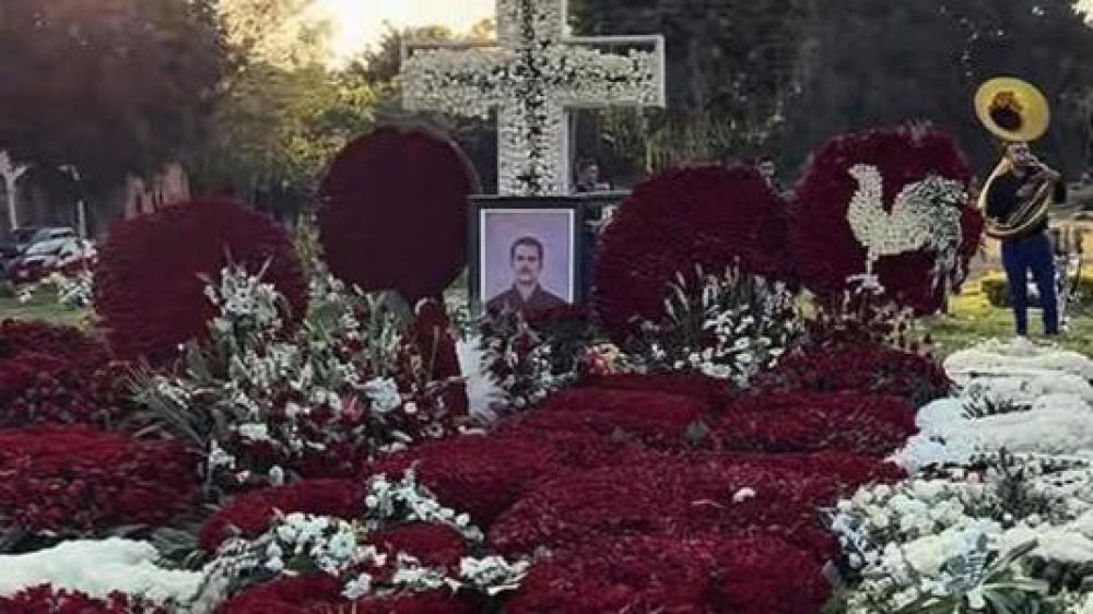 Así es la tumba de “El Mencho”... Al ras del césped, sin mausoleos elevados ni estructuras ostentosas que delimiten el espacio, la tumba destaca únicamente por la abundancia de coronas y arreglos florales en tonos rojo y blanco. Algunas composiciones adoptan formas de corazón, cruz y gallos, en referencia al apodo de “El Señor de los Gallos”. Una fotografía en blanco y negro colocada bajo una corona blanca señala el punto exacto donde fue enterrado el féretro.