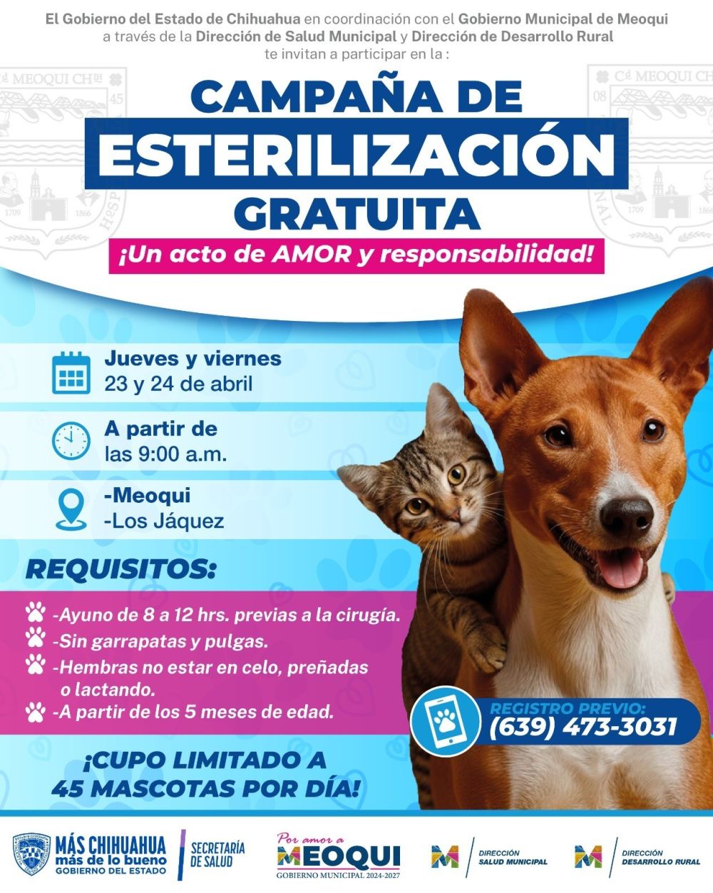 El Gobierno Municipal de Meoqui, a través de la Dirección de Salud, informa que los días 23 y 24 de abril se llevará a cabo una campaña de esterilización gratuita para perros y gatos, en coordinación con el Gobierno del Estado y con el apoyo de la Dirección de Desarrollo Rural, se contara con cupo limitado y previo registro.