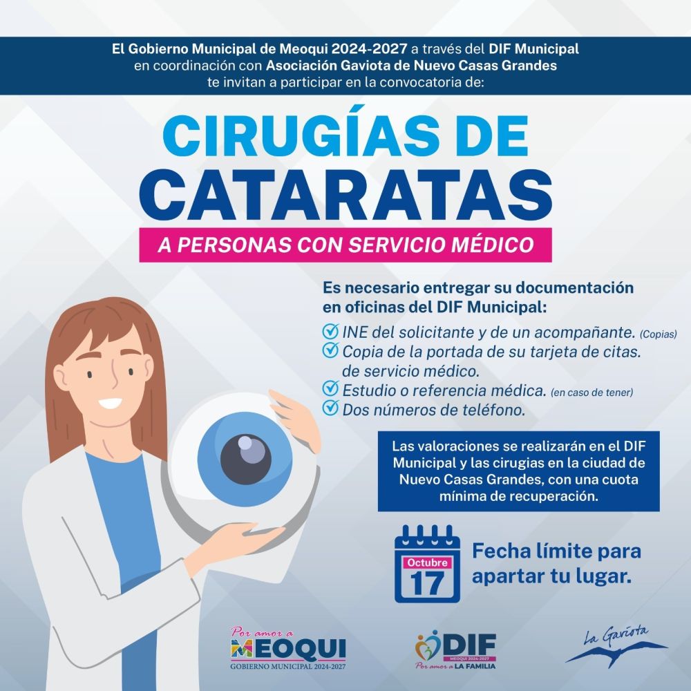 Gracias a la suma de esfuerzos entre el Gobierno Municipal de Meoqui, a través del DIF Municipal, en coordinación con la Asociación Civil Gaviota de Nuevo Casas Grandes, los meoquenses podrán acceder a cirugías de cataratas, teniendo como fecha límite el 17 de octubre para la recepción de la documentación correspondiente, esto de manera gratuita, teniendo solo una aportación voluntaria simbólica de recuperación.