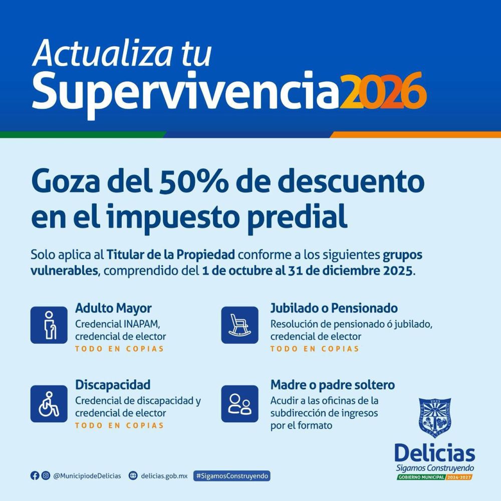 El Gobierno Municipal de Delicias invita a la ciudadanía a actualizar su supervivencia 2026 y así poder gozar de un 50% de descuento en el impuesto predial durante el próximo año. El registro se llevará a cabo del 1 de octubre al 31 de diciembre de 2025, periodo destinado exclusivamente a la firma y actualización de supervivencia.