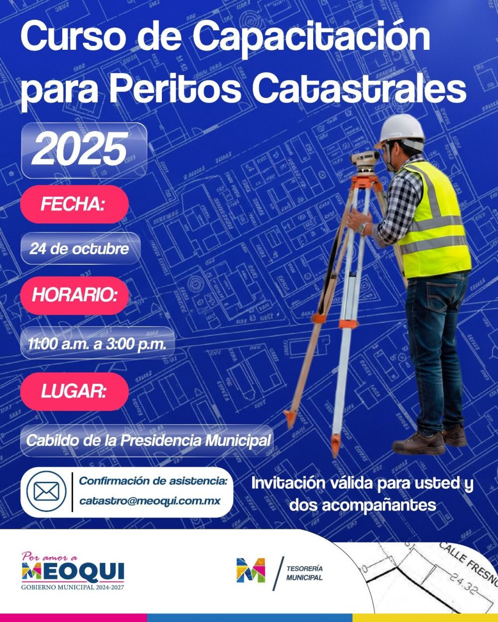 Asimismo, señaló que este curso forma parte de los requisitos para el registro en el padrón de peritos del municipio, una actividad que regularmente se realiza en distintas localidades del estado. “Por primera vez en Meoqui el curso será totalmente gratuito. El único requisito es registrarse en la liga que estará disponible en la página oficial del Gobierno Municipal o bien, enviar un correo a catastro@meoqui.com.mx”, detalló.