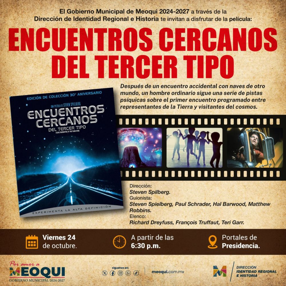 Como parte de las actividades para conmemorar el 38 aniversario de la Leyenda de Los Monitos de Meoqui, el Gobierno Municipal llevará a cabo una edición especial del “Cine Club” con la proyección de la película “Encuentros Cercanos del Tercer Tipo”, cinta clásica de ciencia ficción estrenada en 1977, la cual será exhibida este viernes a las 6:30 de la tarde en los portales de la Presidencia Municipal.