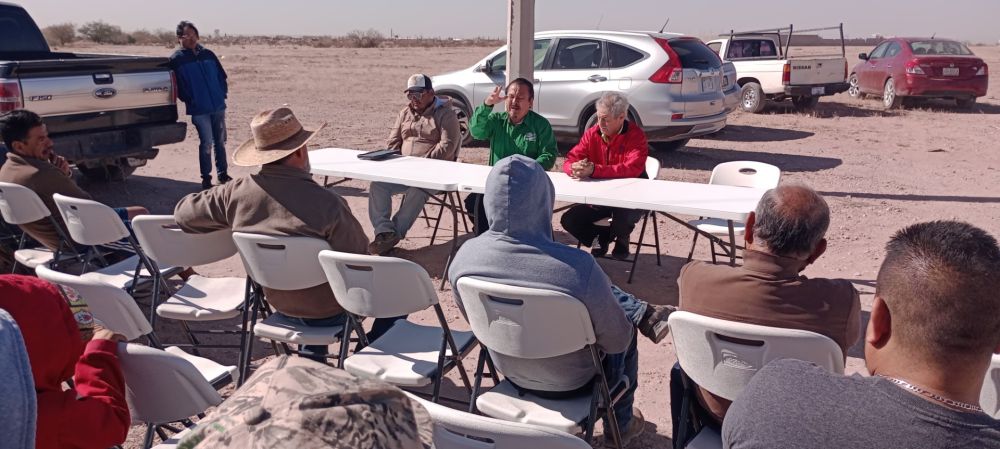 *. - Ante una buena asistencia, se llevó a cabo una reunión informativa en los linderos de los terrenos del ejido 86/4, con la finalidad de llegar a acuerdos entre los interesados en adquirir un terreno y el propietario de 86 hectáreas que cuentan con agua rodada, cableado de energía eléctrica y la comunicación por carretera de Delicias a este lugar prácticamente toda pavimentada.