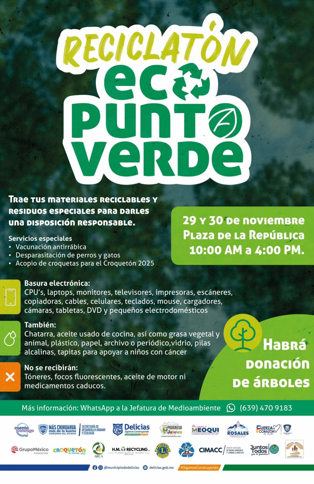 El municipio de Delicias llevará a cabo este 29 y 30 de noviembre el Reciclatón Eco Punto Verde, una jornada destinada a promover la correcta disposición de materiales reciclables y residuos especiales. De acuerdo con Juan Torrecillas, jefe de Medioambiente, el evento se realizará en la Plaza de la República, en horario de 10:00 de la mañana a 4:00 de la tarde.