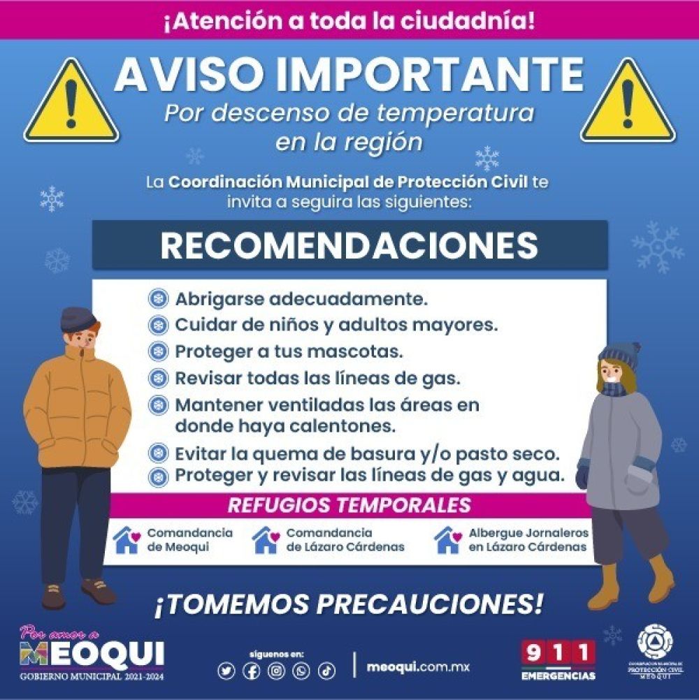 “Durante la noche se estarán realizando rondines por parte de Seguridad Pública y Protección Civil. Ante cualquier emergencia, pedimos a la ciudadanía comunicarse de inmediato al 911, para estos próximos días, especialmente el fin de semana, bajará la temperatura, por lo que pedimos a la ciudadanía tomar precauciones, cuidar a los niños y adultos mayores, revisar constantemente los calentones y verificar que no tengan fugas”, señaló.