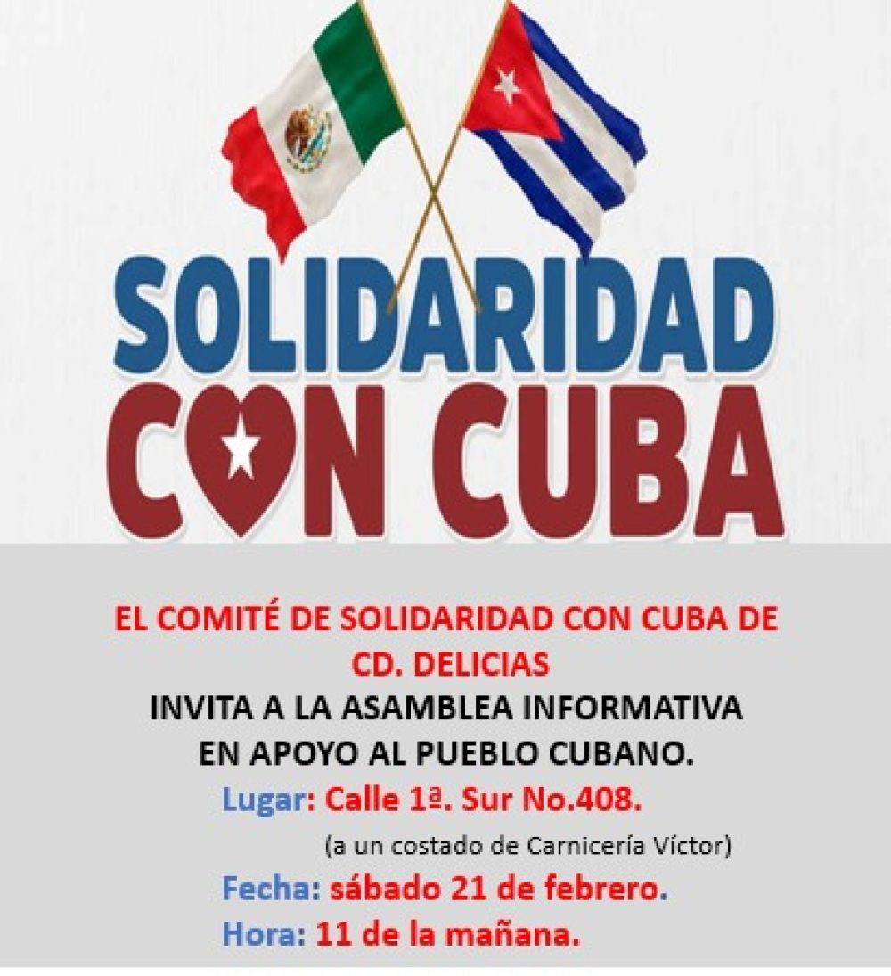 FILANTROPIA. - El próximo sábado se va a realizar una asamblea informativa para ver la forma en que los delicienses y de municipios aledaños analicen la forma de apoyar al pueblo de Cuba, ante la necesidad que tienen sus habitantes por las cuestiones internacionales… aquí se formó un comité por idea del profesor Ernesto Casillas Canales, mismo que cita a una asamblea informativa de apoyo a Cuba… esta se llevara a cabo en la calle primera sur numero 408 a las once de la mañana… la invitación es general para ver la forma de apoyar a los cubanos.